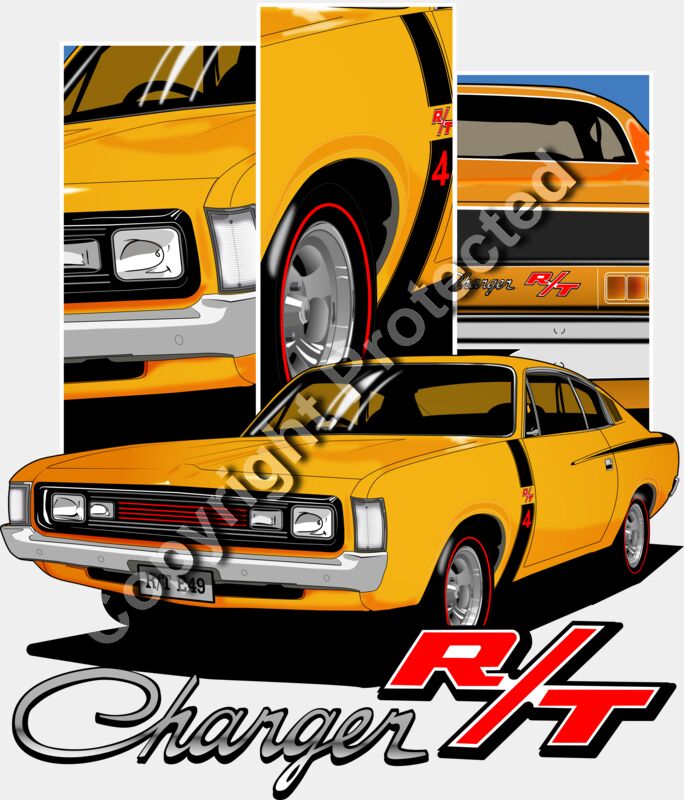 Drawing of the legendary Aussie Charger E49, in a triptych (three panel) layout. Very dominant on Kiwi racetracks for many years too - here's to you, Leo Leonard!